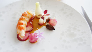 Course 3 features native freshwater marron. Marron is a freshwater crayfish and, as such, exhibit a less salty and sweeter taste than their oceanic cousins. De-shelled and cooked to perfection, the flesh was sweet and succulent and the flavour was rich yet not overpowering. The dish is served with organic pink turnips, jamon de bellota cream, oloroso caramel, almonds and society garlic flower. I have no idea what half of those things are but it tasted super amazing. And that's all that matters right?